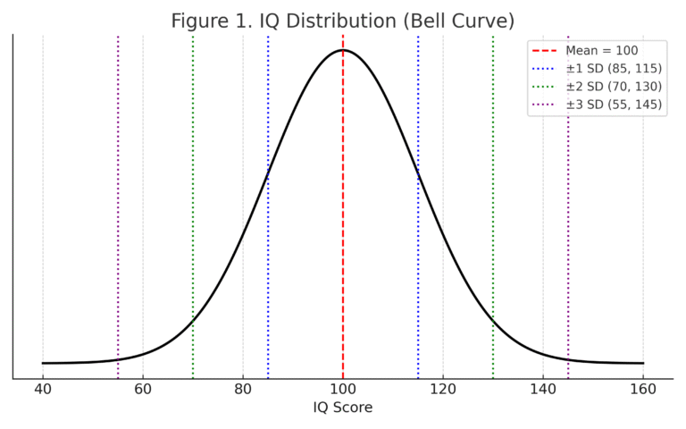 One standard deviation from the mean (85–115) includes about 68.2% of the population. Most people fall within this range.
