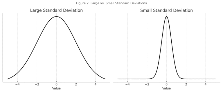 In Figure 2 below, the left diagram shows a large standard deviation, where values are spread far from the mean. The diagram on the right shows a small standard deviation, where values are concentrated near the mean.